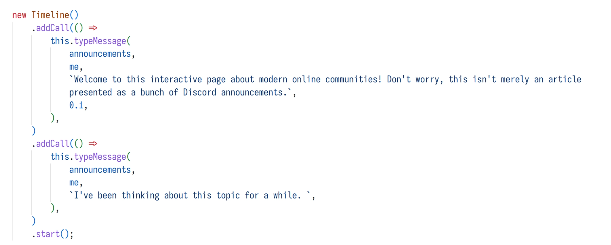 Orchestrating everything is now as easy as this. And implementing the timeline class wasn't too difficult either: push timelines to a global array in their constructor, and call each timelines' step() function in a requestAnimationFrame loop. Depending on the current state, step will do nothing (pending promise or awaiting user input) or call the current function in the stack.